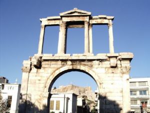 Situé au croisement des avenues Olga et Amalia à l'extérieur de l'enceinte de l'Olympien, l'arc de triomphe fut érigé par les Athéniens en l'honneur de leur bienfaiteur empereur Hadrien au début du IIe siècle ap. JC (131-132). C'est à la fois un monument commémoratif évoquant, en plus modeste, les arcs de triomphe romains, et le lieu de délimitation de l'ancienne ville d'Athènes, construit sur une ancienne rue menant de la vieille ville d'Athènes à la nouvelle section romaine construite par Hadrien et appelé Nouvelle Athènes ou Hadrianoupolis. Le monument, haut de 18 m et large de 13 m, présente deux façades identiques et est divisé verticalement en deux parties bien distinctes. La partie inférieure suit la forme romaine de l'arc de triomphe, tandis que la partie supérieure imite le propylon de la tradition grecque. L’arche unique est encadrée par deux colonnes corinthiennes. L'étage supérieur portait les statues des deux héros fondateurs, Thésée et Hadrien, ainsi mis sur un pied d'égalité. Dans le portique au-dessus du passage voûté se trouvent les inscriptions, du côté ouest : « Voici Athènes, l'ancienne cité de Thésée » et du côté est : « C'est la ville d'Hadrien et non de Thésée ». L'ensemble du monument est en marbre pentélique. En 1778, l'arc fut intégré à la partie orientale des fortifications turques d'Athènes, connue sous le nom de « mur Hasekis », et fut alors transformé en porte, connue sous le nom de « Porte de la Reine » ou « Camaroporta ».