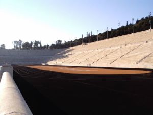 Surnommé stade de marbre ou Kalimarmaro (" Beau Marbre "), le stade Panathénien était d'abord un stade en bois construit en 330 av. J.-C. (Lycurgue) dans un ravin de l'Hélicon. La construction en marbre sera terminée au IIe siècle après J.-C. par Hérode Atticus pour les fêtes panathénées. Les Romains y jouèrent des spectacles. Il fut abandonné de l'époque byzantine à 1895 où il fut reconstruit. Le stade actuel est une copie exacte réalisée en 1869-1870 pour les JO de 1896. Il mesure 190m sur 30m et a une capacité d’environs 60.000 spectateurs. Sa piste, tracée entre deux longs gradins reliés à une extrémité par un arc de cercle (la sphendoné ou fronde), mesure 204,07m de long sur seulement 33,36m de large. La longueur utilisée pour les courses était d'environ 180m, soit un stade attique. Le parcours était jalonné par des bornes en forme d'hermès doubles dont on a retrouvé quatre exemplaires. Les coureurs occupaient toute la largeur de la piste et dans les courses doubles, au lieu d'un virage, ces derniers exécutaient une volte-face à la hauteur de la dernière borne. Il est situé le long de l'avenue Vassiléos-Konstantinou, de l'autre côté du Jardin national. Depuis les premiers jeux d'été, des compétitions d'envergure internationale y sont organisées, dont l'arrivée du célèbre Marathon classique d'Athènes, là même où le Grec Spyros Louis devint le premier champion de marathon de l'Histoire moderne en 1896.