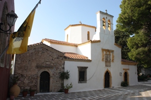 Le monastère est dédié à Agios Théodoros, le protecteur de Cythère. Né à Koroni (Sud du Péloponnèse) vers la fin du IXe siècle, il grandit à Nauplie où il se maria et eut deux enfants. Mais son plus grand désir était de se faire moine. Il visita Rome puis Monemvassia (Sud-est Péloponnèse) et trouva refuge dans une cellule. Vers 921 il visita Cythère alors que l’île était pratiquement désertée de ses habitants, chassés par les pirates crétois. Agios Théodoros resta en tant que moine dans le monastère d’Agios Sergios et Vakchos. Il décéda le 12 mai 922 et peu de temps après des marins ont retrouvé sa dépouille et l’ont enterré sur place. Le vieux monastère fut reconstruit entre les XIIe et XIIIe siècles par des architectes provenant de Monemvassia qui l’ont dédié à Agios Théodoros. Il a été rénové en 1630 par l’épiscope de Cythère Athanasios Valerianos. A l’intérieur il y a aussi une école anglaise restaurée et transformée en musée du monastère. Pas loin de là il y a les traces d’un ancien temple d’Asclépios, dieu de la médecine.