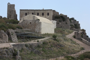 Le château de Chora est le château le mieux conservé de l’île. Il a été édifié au XIIIe siècle fort probablement sur les ruines d’un ancien fort. En 1503 il a été restauré par les Vénitiens et est constitué de deux parties, le château intérieur et une muraille extérieure plus étendue incluant le quartier de Mesa Vourgos (le bourg intérieur). Le château intérieur comprend entre autre les églises Panagia Myrtidiotissa, Panagia Orfani, Pantikrator et Agios Ioannis. La grande Panagia Myrtidiotissa a été bâtie en 1580 par les Vénitiens. C’était un temple catholique, initialement dédié à la « Vierge des Latins », transformée en 1806 en église orthodoxe et dédiée à Panagia Myrtidiotissa. L’icône de Myrtidiotissa était gardée dans cette église protégée par peur d’être volée par les pirates. En 1842 l’icône a été retournée au monastère de Myrtidiotissa. Près de cette église se trouve la petite église Panagia Orfani appartenant à la famille Kalonas. Elle abrita pendant près de 300 ans l’icône et les objets religieux du monastère Agarathos situé Iraklio en Crète alors que la Grande île était sous occupation turque. L’ « Archive historique de Cythère » se trouve dans le Palais d'Armostou, un des bâtiments rénovés du château, ayant servit de QG et des maisons de nobles. Visitez-le, et n’hésitez pas à insister pour qu’on vous parle de l’importance des archives qui datent du début du XVIe siècle. A l’intérieur du fort se trouvent également les églises métropolitaine de Panagia, autrefois catholique, Agios Pandeleimon avec ses fresques murales rares, Agia Triada la plus ancienne église du fort, des poudrières ainsi que deux aqueducs constituant des chefs d'oeuvre rares. On pense que l'église Saint Côme est construite sur les vestiges du temple d'Aphrodite. Autre possibilité : le temple se trouvait dans la région de Viglès ou Kolomès (découvertes archéologiques).