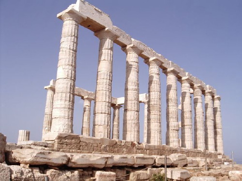 Le temple de Poseidon au cap Sounion est un sanctuaire d'ordre dorique périptère de 31,12m sur 13,47m. Il comptait 6 colonnes en façade et 13 sur les longs côtés. De ces 34 colonnes, 15 ont été relevées. Bien visible sur son promontoire (60m d'altitude), il annonçait autrefois l'Attique aux navigateurs. Vous découvrirez sur un des murs la signature de lord Byron. On y trouve également le temple d'Athéna Sounias.
