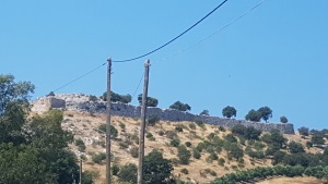 Au sud-ouest d'Araxos se trouvent des fortifications mycéniennes, probablement construites vers 1300 av. JC et identifiées avec le Teichos Dymaion, le mur des Dyméens de Polybe qui, selon cet auteur, dépassait 12m de hauteur (conservé jusqu'à 8,40m). Un puissant rempart en appareil cyclopéen de 4,50 à 5,50m d'épaisseur protégeait trois côtés de la colline, le sud-ouest état naturellement fortifié par la pente raide et le lac. La porte principale était percée sous la protection d'une tour. Une entrée secondaire fut aménagée au milieu du grand côté. Cette porte, murée à l'époque byzantine, était probablement couverte par un arc brisé formé par un encorbellement. A l'intérieur et autour de la fortification, des traces de résidences superposées prouvent l'utilisation intensive de la zone à l'époque mycénienne (1680-1040 av. JC) mais également avant la construction du mur, dès l'ère néolithique (6600-3300 av. JC) au médio-hellénique (2000-1680 av. JC). À l'époque romaine, il faisait partie de la Colonia Iulia Augusta Dumaeorum et était probablement habité par des colons romains. Au cours de la période mi-byzantine (Xe-XIIe s.), d'importantes interventions ont été réalisées dans la forme originale de la fortification. En particulier, un mur a été ajouté au milieu de l'acropole, divisant l'acropole en deux parties, une tour a été construite dans l'angle SE du mur, tandis que la porte dite du milieu a cessé d'être utilisée et a été murée. Les Vénitiens se sont également installés dans le mur de Dymaion, lorsqu'en 1408 l'archevêque latin de Patras leur a loué la baronnie de Patras pour 5 ans. Il semble que l'utilisation du secteur nord de la fortification comme cimetière eu lieu dans la période 1687-1715. Dans les périodes ultérieures, l'habitation de la région était complètement sporadique et ne laissait aucune trace. Au XIXe siècle de nombreux voyageurs étrangers visitèrent le Mur de Dymaion et mentionnèrent que le site était déjà désert. Lors de la Seconde Guerre mondiale, le site a été utilisé comme camp par les forces d'occupation italiennes, qui ont construit à l'intérieur de la fortification des canons d'artillerie, des entrepôts, des abris et des casernes, causant des dommages importants et irréparables aux vestiges antiques. La citadelle, également connue sous le nom de de Kastro tis Kalogrias, domine le sommet de la plus méridionale des hauteurs rocheuses appelée Mavra Vouna et est le seul exemple de citadelle mycénienne fortifiée en Grèce occidentale. Les avantages stratégiques de l'acropole sont évidents, puisqu'elle offre une vue illimitée sur toute la plaine environnante et la zone plus large de l'ancienne Dyma - la région de Dymaia - ainsi que la zone côtière du golfe de Patras au nord et la mer Ionienne à l’ouest, combinée à la richesse naturelle de la péninsule d'Araxos, avec les lagunes, les forêts au gibier abondant et la plaine fertile.