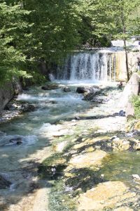 Sources d'eau chaude et paysage montagneux boisé parsemé de cascades. Infrastructures touristiques.