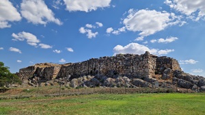 A l’angle nord-est du palais se trouve une rigole pour l'évacuation de l'eau vers un puit menant à un égout destiné à récolter l'eau de pluie des toits. 4 systèmes d'égouts évacuaient toute l'eau de l'acropole. La poterne ouest, accessible par un passage secret, est l'une des constructions les plus saisissantes de l'acropole grâce à un escalier aménagé dans l'épaisseur de la muraille. Remarquez la voûte en encorbellement de la poterne.