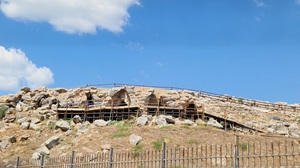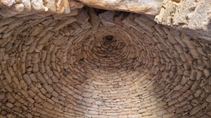 Tombes à coupole Environ à 1km de la citadelle de Tirynthe sur le versant occidental de la colline de Prophitis Ilias, une tombe à coupole a été fouillée en 1913. Le dromos (= couloir), construit après la coupole, est long de 13m et large d’environ 3. Les parois sont revêtues de blocs en calcaire grossièrement taillées. La porte d'entrée du tombeau était décorée de fresques à spirales. Le linteau est constitué d'une dalle monolithique mesurant 3x2x0,40m, tandis que le seuil n'est pas conservé. L’entrée était fermée par une porte à deux battants. Le tholos est circulaire, de 8,45 à 8,50 m de diamètre. Les deux couches inférieures ont été construites en grosses pierres, le reste en blocs de calcaire, comme le dromos. Du côté nord, une fosse funéraire a été trouvée avec un revêtement en plâtre non décoré. Aucune poterie mycénienne n'a été trouvée dans la tombe. Il est possible que son contenu ait été supprimé à l'époque romaine, sans exclure la possibilité qu'il n'ait jamais été utilisé. Sa construction est contemporaine à la troisième phase de construction de l'acropole. Comme le confirment les tessons protocorinthiens et à figures noires trouvés dans la fosse du tombeau et sur la route, le tombeau devait déjà être ouvert à cette époque. Le type de trouvailles prône un culte du héros. À l’époque impériale romaine, son intérieur fut transformé en pressoir à olives. Une seconde tombe à coupole dont le dromos avait déjà été localisé en 1913, a été partiellement fouillée dans les années 80 au SO de la première.