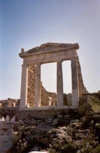 Dans les environs, au pied du mont Cynthe, se trouve la grotte (Antron) qui abrita l'oracle d'Apollon ou, selon les versions, des cérémonies vouées au culte d'Héraclès lors de l'époque hellénistique. A flanc de colline, on trouve le sanctuaire archaïque de Zeus et d'Athéna.